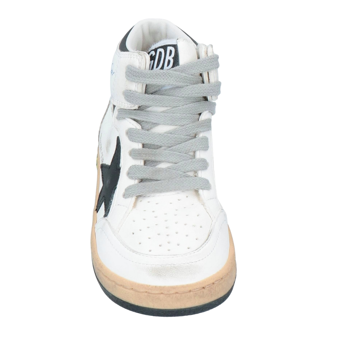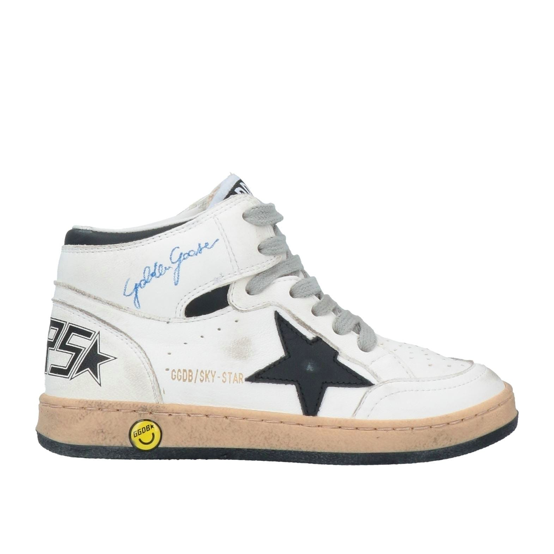De Golden Goose Sky-Star high-top sneaker is een gedurfde mix van retro basketbalstijl en moderne streetwear. Uitgevoerd in wit leer met een contrasterende zwarte ster op de zijkant, grijze veters en een beige zool met zwarte onderzijde, straalt dit model karakter en attitude uit. Op de zijkant staat het blauwe “Golden Goose”-logo met daaronder de subtiele branding “GGDB/SKY-STAR”. De hiel is voorzien van een zwart-wit “G5”-embleem met ster, terwijl een gele smiley met “GGDB” bij de zool een speels accent toevoegt. Deze sneaker is ideaal voor wie houdt van opvallende details, Italiaanse flair en een uitgesproken stijl.